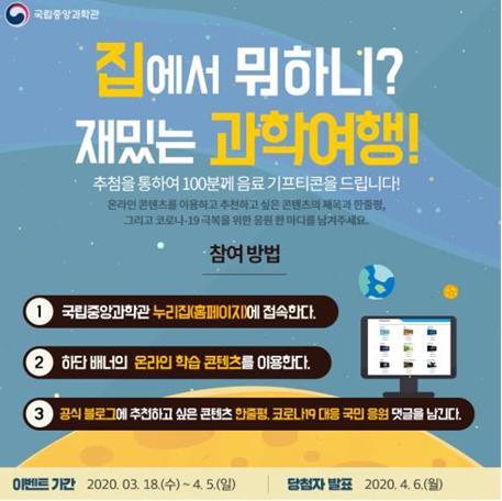 집에서 과학관 온라인학습콘텐츠를 이용한 후 간단한 이용후기 한 줄 평과 함께 코로나19로 지친 국민들을 위한 응원메시지를 국립중앙과학관 블로그(blog.naver.com/nsmscience)에 댓글로 게재하면 추첨을 통해 총 100명에게 5,000원 상당의 온라인 상품권을 제공할 예정이다.
