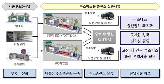 동사업을 통해 350기압과 700기압의 충전설비를 조합하여 2가지 형태의 수소충전소를 구축하고 에너지소비량, 버스노선 운영패턴 등을 실증하여 최적화된 수소버스 충전방식을 마련할 계획이다.