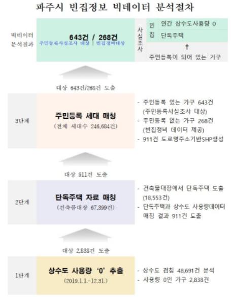 1차적으로 상수도 검침 데이터와 건축물대장 데이터를 비교해 빈집 추정 단독주택 목록을 작성했고 이와 주민등록 데이터를 매칭·분석해 주민등록 사실조사 대상 목록을 작성했다.
