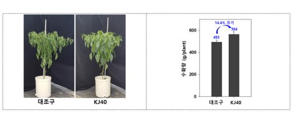 또한 식물은 건조 스트레스를 받으면 기공전도도가 점차 감소해 이산화탄소 흡수율이 줄어 생장이 더뎌진다. 그러나 KJ40 균주를 처리한 고추의 잎 기공전도도(48.4mmol/m2/sec)가 아무것도 처리하지 않은 고추(31.1mmol/m2/sec)보다 높아 건조 스트레스 피해를 줄이는 것으로 확인됐다.