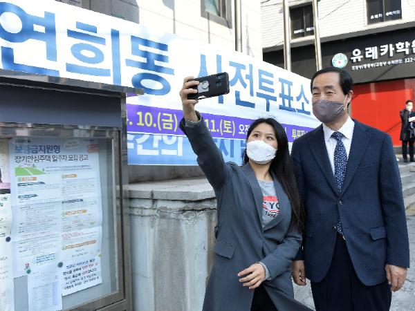 [더연합타임즈, 이광민기자] 문석진 서대문구청장이 10일 오전 8시 30분 연희동주민센터에 마련된 투표소에서 제21대 국회의원 선거 사전 투표를 한 뒤, 한 주민의 인증샷 촬영 요청에 응하고 있다.