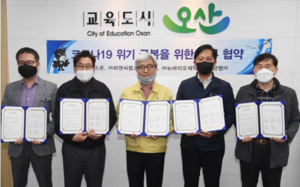 이날 협약식에는 곽상욱 오산시장과 ㈜뉴바이오제약 백승철 대표, 윤지양행(주) 윤용만 대표, ㈜피앤씨랩스 엄성길 대표, ㈜코스온 박의훈 부사장 등이 참여했다.