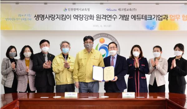 인천시교육청(교육감 도성훈)은 10일(금) 디지털교육 전문기업인 테크빌교육 생명지킴이 교직원 원격연수 개발을 위한 기술 제휴 업무 협약을 체결했다. 이에 인천시교육청은 다양하고 안정적인 원격연수 플랫폼을 확보하게 되었다.