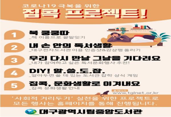 대구중앙도서관(관장 정근식)은 4월 9일(목)부터 4월 24일(금)까지 코로나19 극복, “사회적 거리두기”실천 집콕 프로젝트 온라인 독서문화행사를 기획?운영한다.