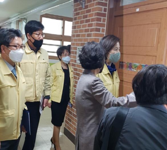 유은혜 부총리와 전성화 교육장은 덕천초등학교 돌봄교실, 컴퓨터실을 둘러보며 학교 온라인 개학 대비 원격수업 지원 방안, 긴급돌봄 운영현황, 코로나19 관련 학교 안전관리 등을 함께 살펴보았다.