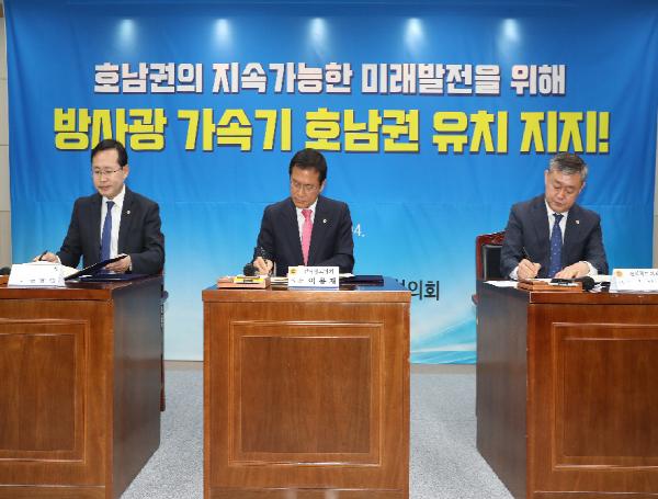 호남권 3개 시도의회 의장은 “인류의 새로운 미래인 4차 산업혁명 시대에 호남이 국가발전을 선도하고 대한민국의 미래를 이끄는 중심지로 도약하기 위해서는 4세대 원형 방사광가속기가 광주?전남 공동혁신도시에 반드시 유치되어야 한다.”며 뜻을 모았다.