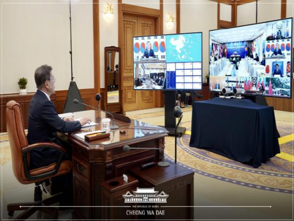 문재인 대통령은 14일 오후, 아세안%2B3 특별 화상 정상회의에 참석해 코로나19 대응 공조 방안과 사회?경제적인 부정적 영향 최소화 방안을 논의했다.