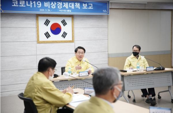아산시(시장 오세현)는 4월 13일 시청 상황실에서 개최된 제5차 코로나 비상경제 대책회의에서 코로나19 피해 대응 및 지역경제 활성화를 위한 대책을 논의했다.