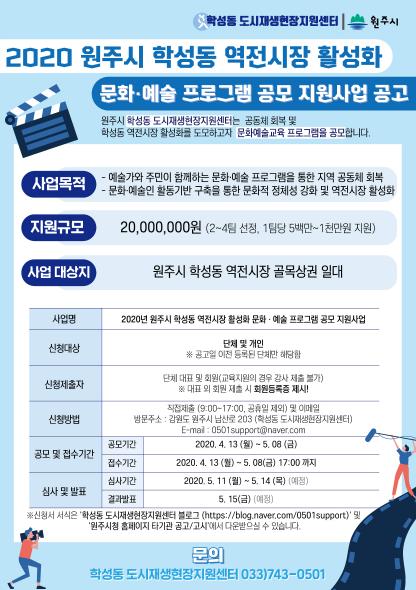 자세한 사항은 원주시청 홈페이지 또는 학성동 도시재생현장지원센터 블로그(https://blog.naver.com/0501support)에서 확인하거나 전화(033-743-0501)로 문의하면 된다.