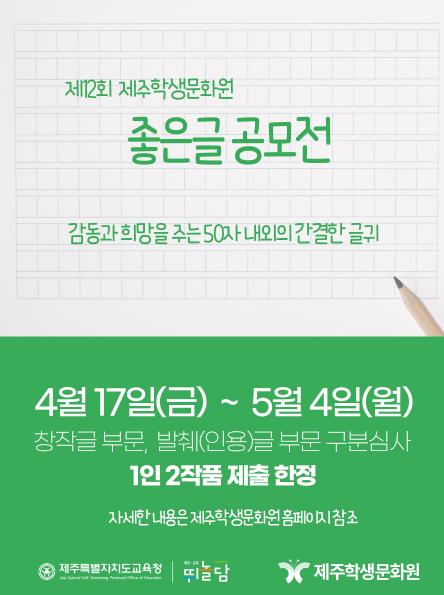 제주학생문화원(원장 임연숙)은 도내 학생, 학부모, 교육가족을 비롯한 제주도민에게 감동과 희망의 메시지를 전달함으로써 지역사회와 함께 소통하고, 도민의 정서 함양을 도모하고자 ‘제12회 좋은글 공모전’을 실시한다.