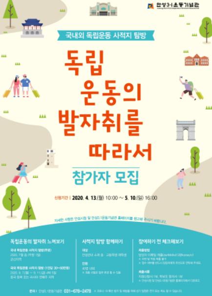 [더연합타임즈, 유현민기자] 안성3.1운동기념관은 안성 관내 소재 중·고등학교 재학생을 대상으로 오는 5월 10일(일)까지 국내외 독립운동사적지 탐방 “독립운동의 발자취를 따라서” 참가자를 모집한다.