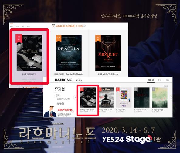 [더연합타임즈, 유현민기자] 아름다운 선율과 함께 진정성이 담긴 위로를 전해 화제가 된 뮤지컬'라흐마니노프'가 3차 티켓 오픈과 동시에 예스24티켓 전체 부문 예매율 순위 1위, 인터파크티켓 창작뮤지컬 부문 예매율 순위 1위를 기록했다.