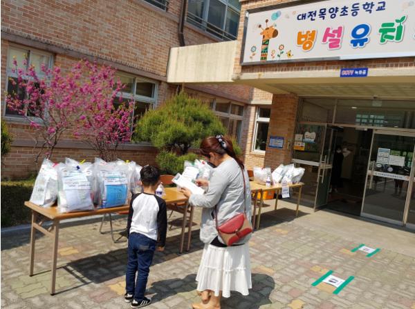 대전목양초등학교병설유치원(원장 이민)은 코로나19로 인해 개학이 무기한 연기됨에 따라 신입생 및 재원생 유아들이 각 가정에서도 유치원 놀이 활동을 할 수 있도록 4월 16일(목), 17(금) 2일간 유치원 현관 앞에서 워크스루를 통해 ‘가족과 함께하는 도담도담 놀이보따리’를 배부하였다.