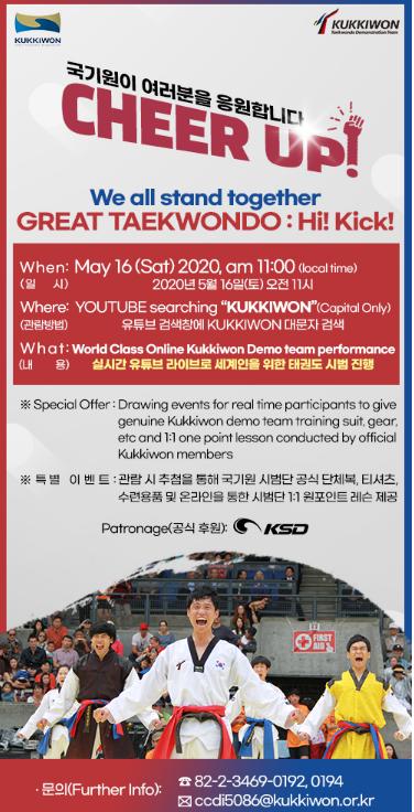 ‘하이킥’은 오는 5월 16일(토) 오전 11시 국기원 유튜브 채널(https://www.youtube.com/user/kukkiwonpr)을 통해 생방송으로 진행된다.