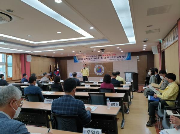전라남도순천교육지원청(교육장 이길훈)은 5월 11일(월) 대회의실에서 순천시 보건소와 함께 단계적 순차 등교 대비 교장회의를 실시했다.