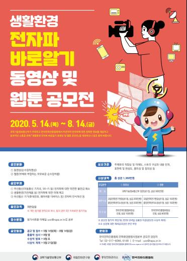 이번 공모전은 이동통신·와이파이(Wi-Fi) 등 무선통신, 가전·사무기기와 휴대전화·무선이어폰·스마트워치 등 무선기기 등 생활속 제품에서 발생하는 전자파에 대한 올바른 이해를 증진 시킬 수 있는 내용을 주제로 하며, 동영상 및 웹툰 등 순수창작물로 제작하면 된다.