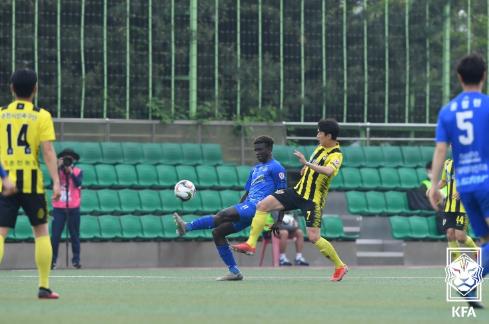 경기 초반부터 주도권을 가져간 쪽은 춘천이었다. 양주는 파이브백을 활용해 수비에 집중했다. 양주는 수차례 실점 위기를 넘겼고, 때로 역습을 활용해 골을 노렸다. 역습을 시도할 때면 “마틴! 마틴!” 외치는 소리가 고덕구장을 가득 메웠다. 지난해까지 고양시민축구단(K4)에서 뛰었던 남수단 출신 공격수 마틴을 부르는 소리다. 마틴은 동료들의 지원을 받으며 전방을 열심히 누볐고 몇 차례 슈팅을 시도했으나 골을 넣지는 못했다.