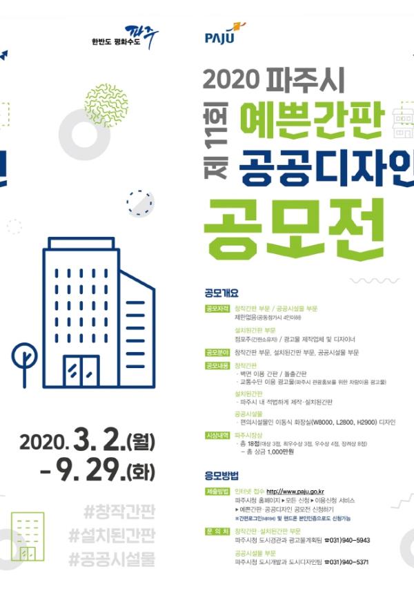 제11회 파주시 예쁜간판·공공디자인 공모전에서는 그동안 공개되거나 설치된 적이 없는 벽면 이용 간판, 돌출간판, 파주시 관광홍보 교통수단 이용 광고물 등 창작 간판 부분, 기존에 설치된 간판 중 우수간판, 공공시설물인 이동식화장실디자인 등 3개 분야를 접수한다. 수상작은 공공디자인 진흥위원회의 심사를 거쳐 대상(파주시장상)3점과 최우수상 등 총 18점, 총 상금 1천만 원을 오는 11월에 시상할 예정이다.