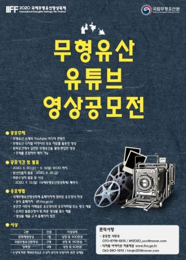 [더연합타임즈, 정정래기자] 문화재청 국립무형유산원(원장 김연수)은 정부혁신의 역점과제로 추진 중인 ’2020 국제무형유산영상축제‘(9.11.~13.)의 하나로 ‘무형유산 유튜브 영상공모전’을 개최한다.