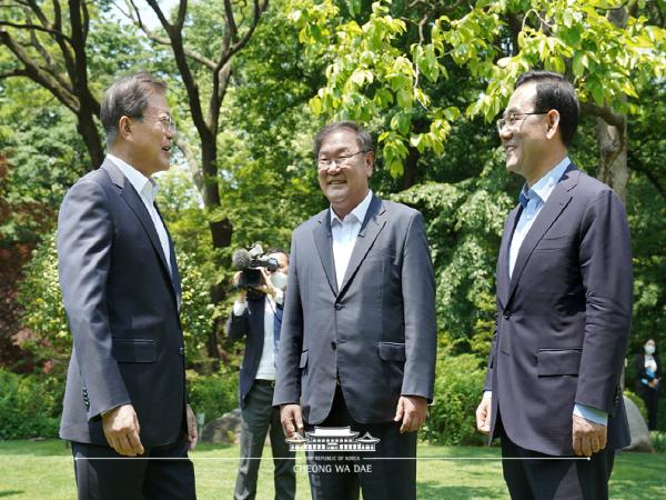 문 대통령은 “국회가 법에 정해진 날짜에 정상적 방식으로 개원을 못해 왔다”면서 “시작이 반이라고, 두 분이 역량을 잘 발휘해 달라”고 당부했다.