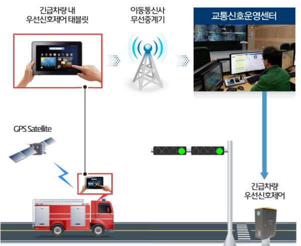 긴급차량 우선신호시스템은 소방차 등 긴급차량의 이동 위치를 미리 감지해 정차 없이 교차로를 통과하도록 신호를 제어하는 시스템으로, 긴급출동 차량의 이동속도 향상과 사고현장 도착시간 단축 및 긴급차량의 사고 예방에 기여할 전망이다.