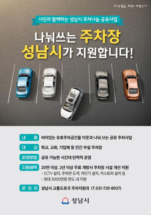 [더연합타임즈, 장운조기자] 성남시는 지역 내 주차난 해소를 위해 민간 부설주차장을 대상으로 ‘주차나눔 공유사업’을 편다.