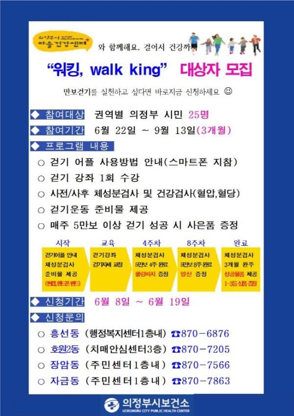 의정부시보건소(소장 이종원) 마을건강센터는 지역주민들의 건강생활실천을 위한 걷기프로그램 ‘워킹(Walk King)’ 참여자를 모집한다.
