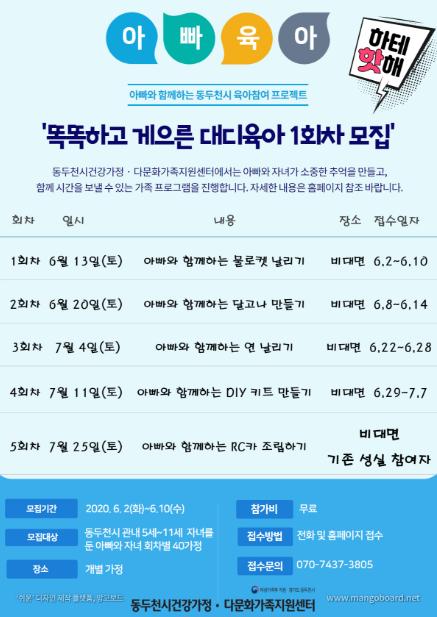 신청자격은 동두천시 내 5세~11세 자녀를 둔 아빠와 아이들이 함께 참여하면 되며, 희망자는 동두천시건강가정·다문화가족지원센터 홈페이지 또는 전화(☎070-7437-3805)로 문의 및 접수 가능하다.