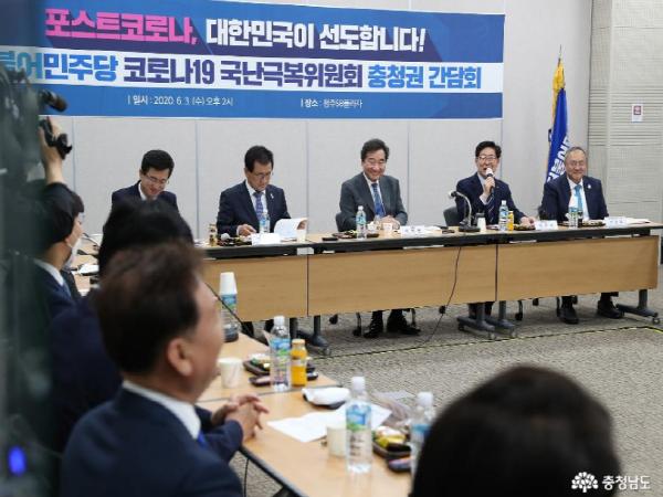 양 지사와 이낙연 국난극복위 위원장, 허태정 대전시장, 이춘희 세종시장, 이시종 충북도지사, 지역 국회의원 등 30여명이 참석한 가운데 열린 이날 간담회는 위원장 및 광역단체장 모두발언, 광역단체장 건의, 지역 현장 방문 등의 순으로 진행됐다.