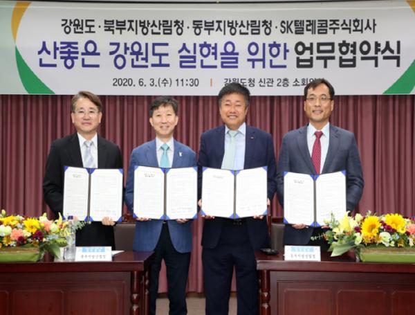 [더연합타임즈, 김서윤기자] 강원도는 지난 3일 강원도청 신관 소회의실에서 SK텔레콤주식회사 (ICT Infra센터장 강종렬)와 북부지방산림청(청장 최수천), 동부지방산림청(청장 이상익) 4자간에 산림관련시설 및 통신사 인프라를 공동으로 활용할 목적으로 「산좋은 강원도 실현을 위한 업무협약식」을 가졌다.