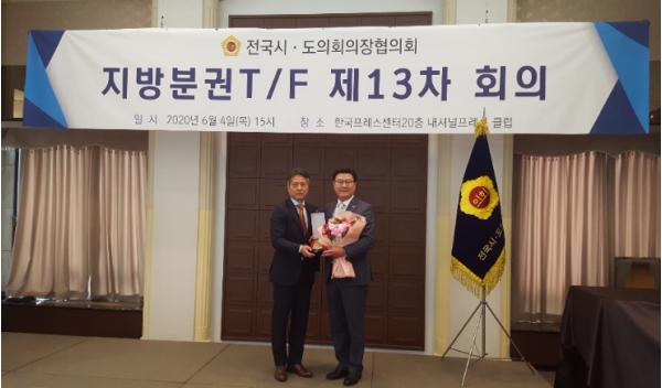 신원철 회장은 ‘문승우 의원은 2018.10.11.~2020.6.30. 전국시도의회의장단협의회 지방분권TF위원으로 활동하면서 열정적이고 헌신적인 활동을 펼쳐 자치분권 활성화와 지방의회 발전에 크게 이바지해 공로패를 수상하게 됐다’고 밝혔다.