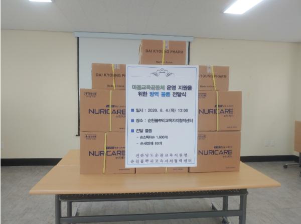 전라남도순천교육지원청(교육장 이길훈)은 코로나19 감염 예방과 순천마을교육공동체의 안정적인 운영지원을 위해 순천풀뿌리교육자치협력센터를 방문하여 순천마을학교협의회 대표(놀빛송산마을학교 강병택)에게 손소독티슈와 손세정제 등의 방역물품을 전달했다. 방역물품은 순천마을학교협의회 및 마을교육지원 활동가들을 통해 관내 마을교육공동체로 전달할 예정이다.