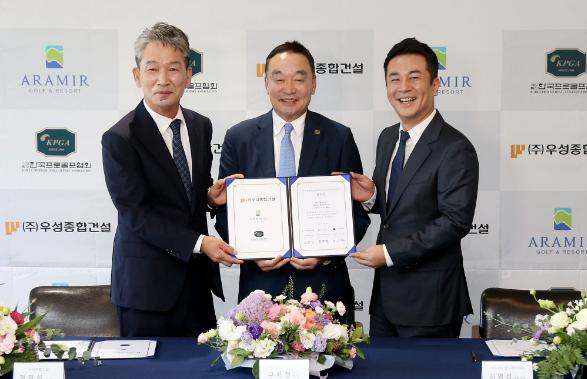 이날 조인식에는 ㈜우성종합건설 정한식 대표이사와 아라미르 골프 앤 리조트 김명섭 대표이사, KPGA 구자철 회장 등 관계자들이 참석해 대회 개최를 위한 협력을 약속했다.