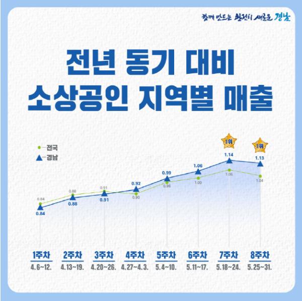 [더연합타임즈, 차천영기자] 경남지역 소상공인 카드매출 증가율이 전년 동기대비 2주 연속(5.18~31.) 전국에서 가장 높게 나타났다