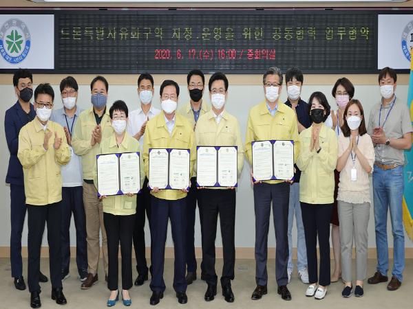 대전시는 17일 오후 4시 시청 중회의실에서 3개 구청(서구, 유성구, 대덕구)과 ‘드론특별자유화구역(이하 드론특구) 지정ㆍ운영을 위한 공동협력 업무협약’을 체결했다.