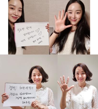 '결백'의 주역 신혜선과 배종옥은 쉽지 않은 상황 속에 50만 관객을 돌파한 것을 기념해 관객들에게 그 마음을 전했다. 50만을 상징하는 포즈로 환하게 웃고 있는 두 사람의 모습이 눈길을 끈다.