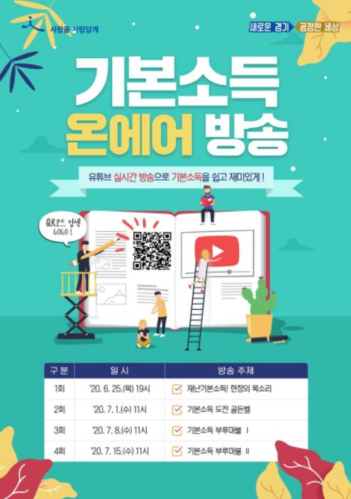 경기도는 기본소득 온에어 방송을 25일 목요일 오후 7시에 처음 방송하고 7월 1일부터 15일까지 매주 수요일 오전 11시 유튜브 경기도 기본소득 온에어 방송 채널(https://www.youtube.com/channel/UC1S4s7FBjIolXcaN5CyD8mg)을 통해서 공개할 예정이다.