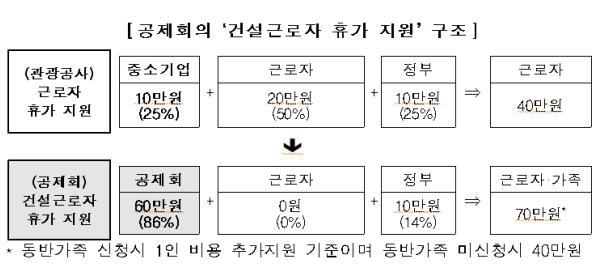 공제회 송인회 이사장은 “코로나19의 확산으로 매년 추진해 왔던 가족 힐링캠프를 통해 해외 가족여행의 혜택을 드리기 어려운 상황이었으나, 한국관광공사와 협업으로 건설근로자의 가족여행을 계속 지원할 수 있게 되었다.”라며, “건설근로자 휴가지원 협업이 코로나19로 지친 건설근로자에게는 힐링의 기회가 되고 국내 관광산업을 비롯한 내수경기의 활성화에 조금이나마 도움을 드릴 수 있게 되길 바란다.”고 밝혔다.