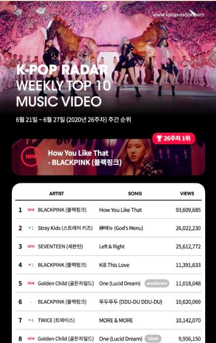 블랙핑크의 신곡 ‘How You Like That’ 뮤직비디오는 케이팝 레이더 2020년 26주 차 집계 기간(6월 21일~6월 27일) 동안 9,360만 뷰를 기록하며 케이팝 레이더 주간 유튜브 조회수 차트 1위에 올랐다. 이는 케이팝 레이더 사상 가장 높은 수치다.