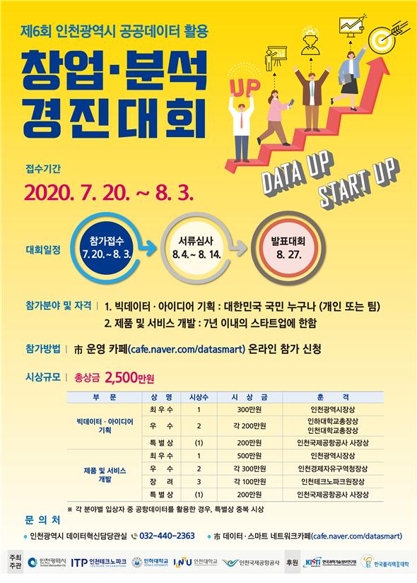 인천시(시장 박남춘)는 공공데이터를 활용한 창의적 아이디어와 비즈니스 모델을 발굴하기 위해‘제6회 공공데이터 활용 창업?분석 경진대회’를 8월 27일 개최한다고 밝혔다.