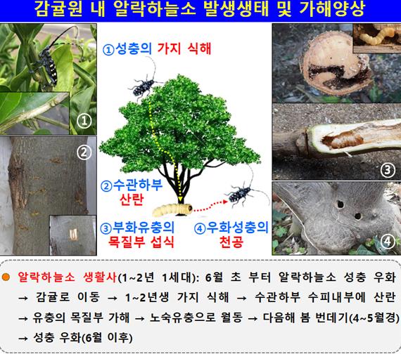 한편, 농촌진흥청이 지난해 알락하늘소가 10마리 이상 발생한 친환경 감귤과수원 7곳을 대상으로 피해 양상을 조사한 결과, 전체 나무의 약 35.4%가 알락하늘소 애벌레 피해를 본 것으로 나타났다.