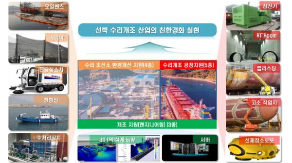 중대형선박을 대상으로 ▲친환경 수리·개조지원센터, ▲수리·개조 공정지원 장비구축(자동선체 표면 청소장비 등 수리·개조 공정의 효율성 향상을 위한 장비구축) ▲야드 환경개선 장비 구축(청항선, 진공청소차 등 수리·개조 과정에서 발생하는 환경오염 물질의 확산 방지 및 제거를 위한 클린장비 구축), ▲수리·개조분야 기술 개발 및 기업지원 등을 추진할 계획이다.