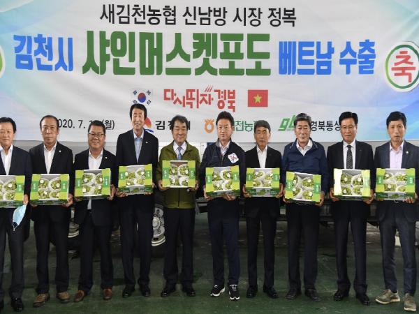 이철우 도지사는 새김천농협 농산물산지유통센터(APC)에서 김천시장, 김유태 ㈜경북통상 대표, 농업인 등과 함께 ‘샤인머스켓 포도 수출 상차식’에 참석해 샤인머스캣의 금년도 첫 수출물량이 베트남으로 출발하는 현장을 참관했다.