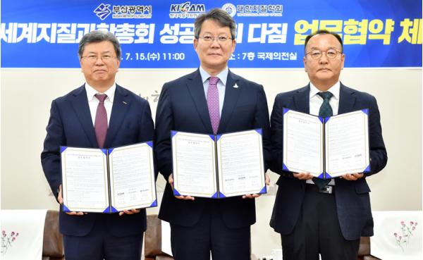 부산시(시장 권한대행 변성완)는 한국지질자원연구원, 대한지질학회와 함께 7월 15일 오전 11시 시청 국제의전실에서 2024년 세계지질과학총회(IGC-International Geological Congress) 부산대회 성공 개최를 다짐하는 업무협약(MOU)을 체결했다고 밝혔다.
