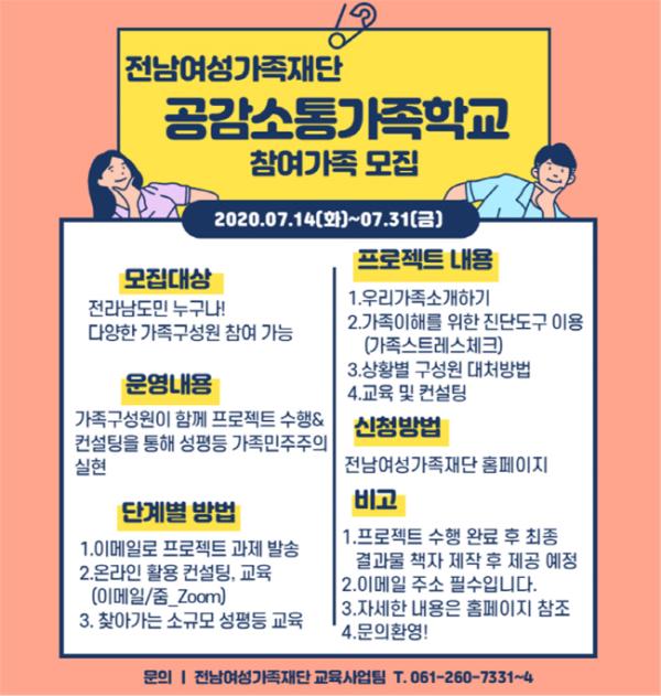 신청기한은 오는 31일까지로, 참여를 희망한 가족은 전남여성가족재단 누리집으로 신청하거나, 전남여성가족재단 교육·사업팀(061-260-7331~4)으로 문의하면 된다.