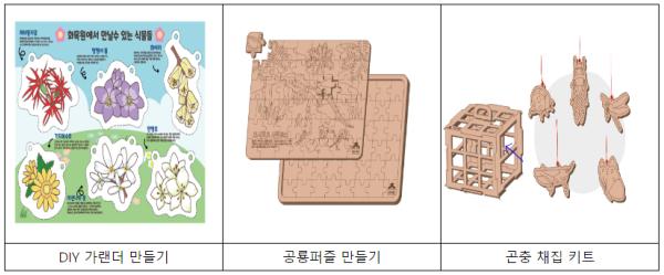 ‘체험꾸러미’는 강원도립화목원에서 만날 수 있는 희귀·특산식물 및 산림박물관 기획전시와 연계된 3종 교구재로‘식물 DIY 가랜더 만들기’, ‘공룡퍼즐’, ‘곤충채집키트’로 구성되어 있다.