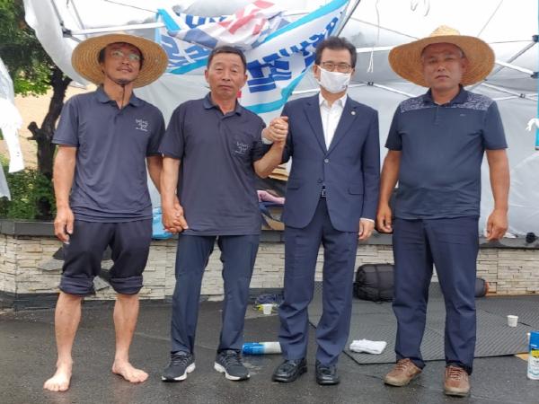 [더연합타임즈, 유창렬기자] 충청북도 이시종 지사는 22일 도청 앞에 천막을 치고 농민수당 도입을 촉구하며, 시위를 벌이고 있는 농업인단체 임원들과 만남을 가졌다.